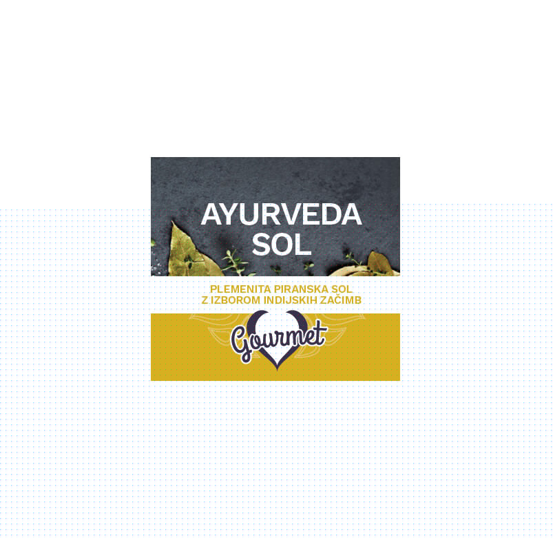 AYURVEDA GOURMET SOL je nepredelana sol in solni cvet iz Sečoveljskih solin (Slovenija) in je bogata z minerali in mikroelementi iz Jadranskega morja, ki še posebej ugodno vplivajo na počutje in delovanje prebave. Z dodatkom skrbno izbranih zelišč in začimb nam ta edinstvena mešanica daje vseh 6 okusov hkrati: grenko, kislo, slano, pekoče, sladko in trpko. Vsi ti okusi uravnavajo energijo v telesu in spodbujajo njegovo pravilno cirkulacijo in ravnovesje, kar zagotavlja harmonično delovanje vseh organov.