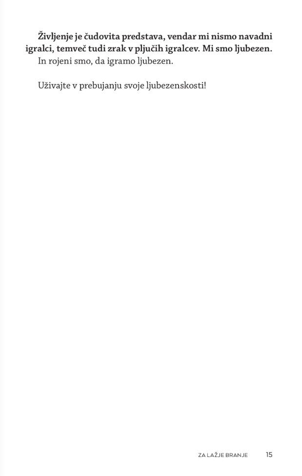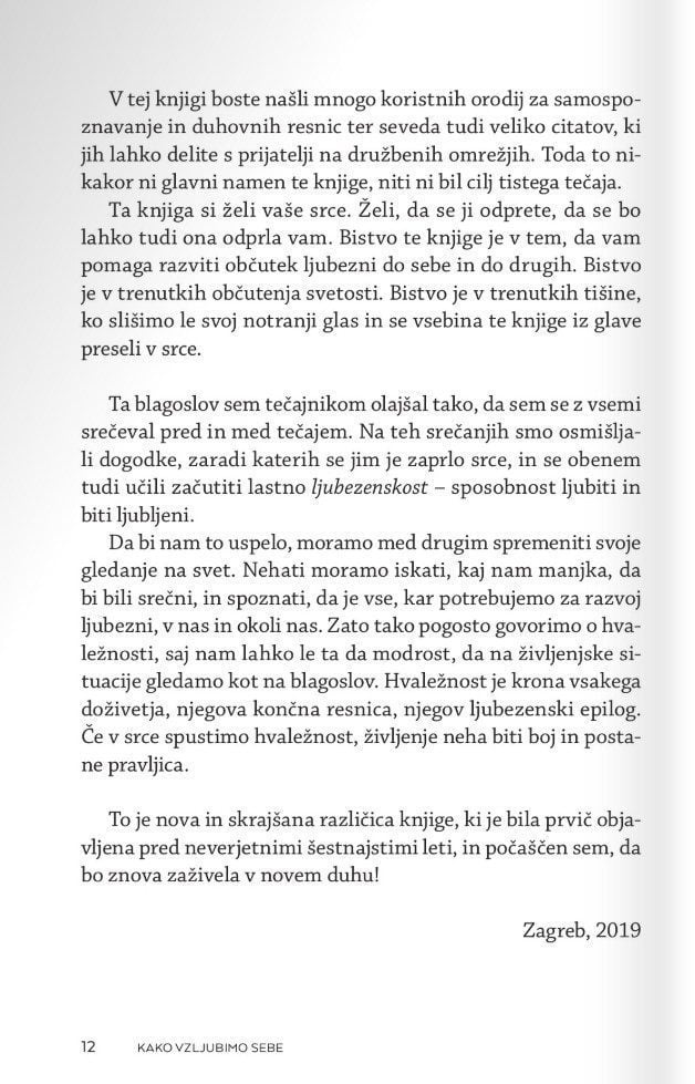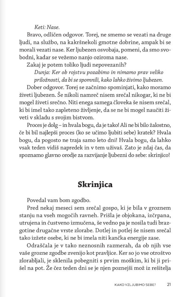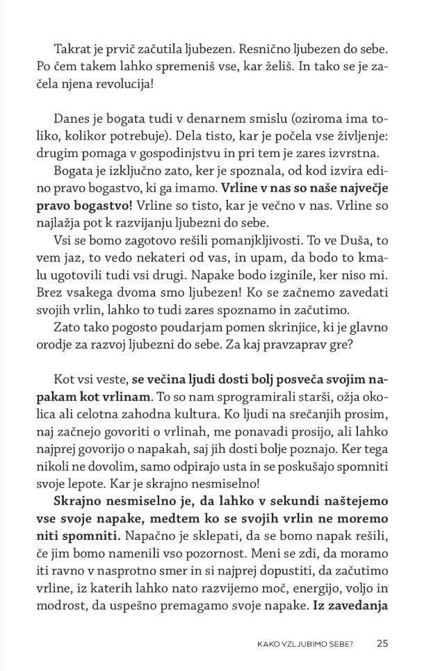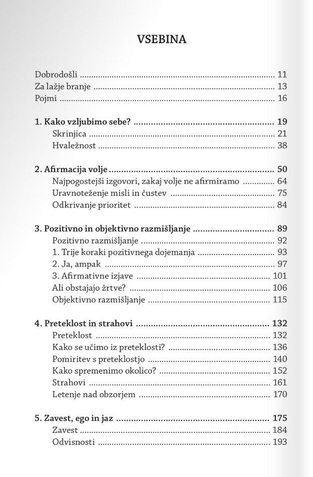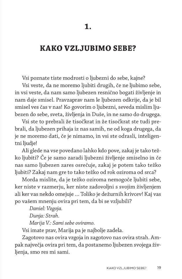 Zakaj je tako težko ljubiti? Kaj je hvaležnost? Kaj so naše prioritete? Kako spremenimo svoje prepričanje in odnos do sebe? Kako pozitivno mislimo, ne da bi olepševali ali se pretvarjali, da je vse v redu. Kako se otresemo strahov in pomirimo s preteklostjo? Kako sprejmemo odnos s starši, čeprav nam niso dajali vsega, po čemer smo hrepeneli? Kaj se zgodi, ko umremo?