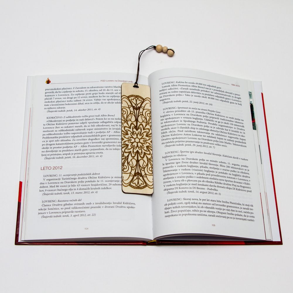 Naravno knjižno kazalo je nepogrešljiv pripomoček za vse ljubitelje knjig, saj bo vedno opominjalo, na kateri strani nadaljevati z branjem. Kazalo z različnimi vzorci, motivi ali napisi je izdelano iz naravnega materiala – vezana plošča topol ali bukev, debelina 3mm.