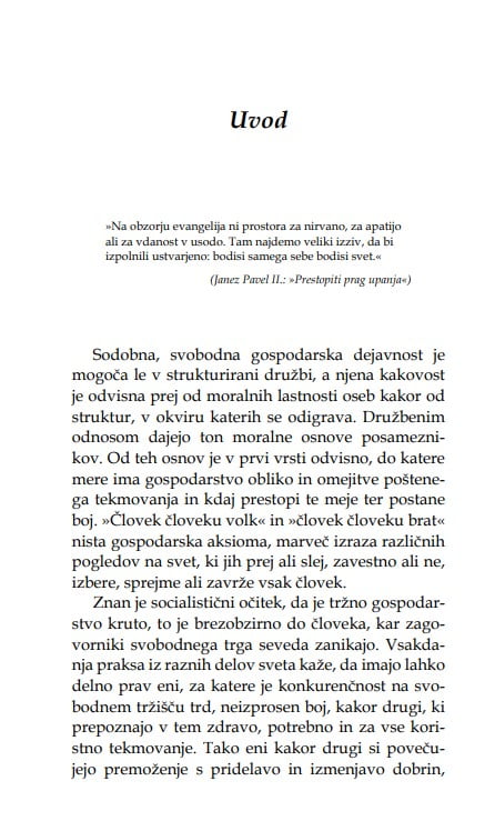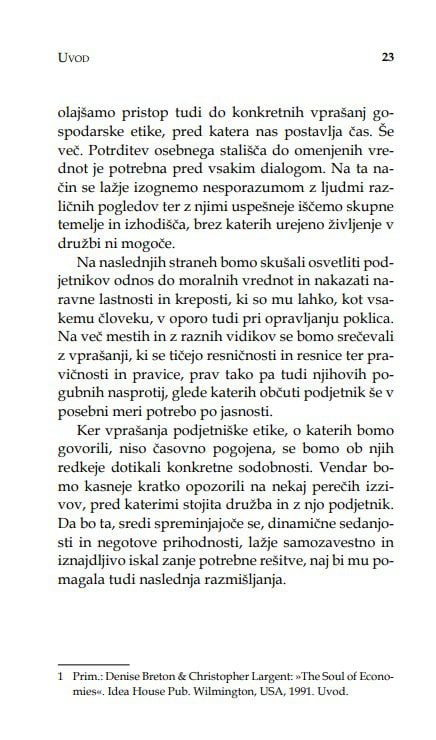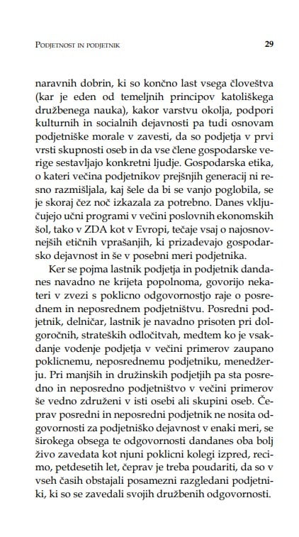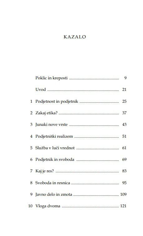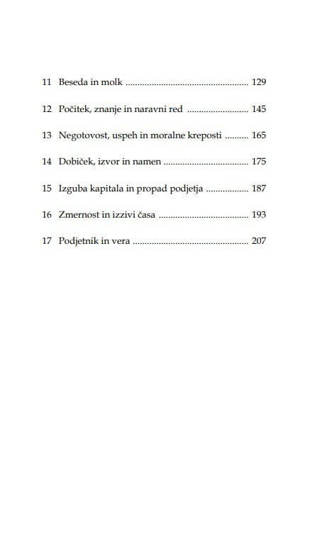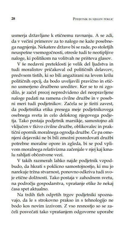 V knjigi je opisan podjetnikov odnos do moralnih vrednot in naravne lastnosti in kreposti, ki so mu lahko, kot vsakemu človeku, v oporo tudi pri opravljanju poklica. Na več mestih in z raznih vidikov se srečujemo z vprašanji, ki se tičejo resničnosti in resnice ter pravičnosti in pravice, prav tako pa tudi njihovih pogubnih nasprotij.