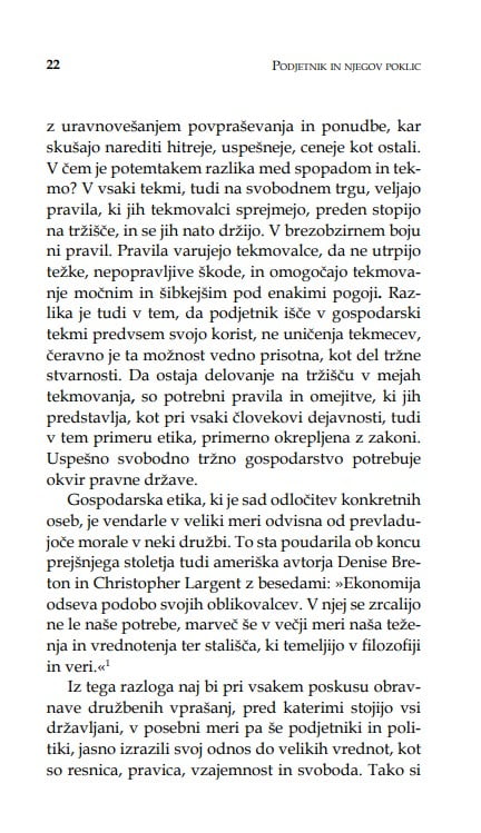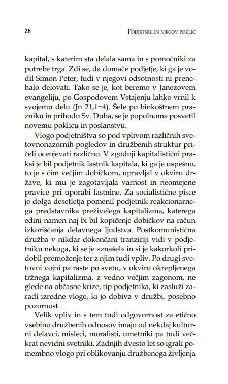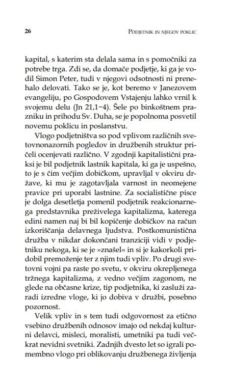Stopnjevanje poslovne uspešnosti ni edini kriterij, po katerem prepoznavamo lik podjetnika. Odlikuje ga razvijanje lastnih talentov in uresničevanje kreposti v vsakdanjih odločitvah. Lik podjetnika je lik modrega moža ali žene, ki v svojem delu prepoznava predvsem osebno in družbeno poklicanost. S takšnim razmišljanjem si vsak državljan, ne le poslovnež ali politik, olajša pristop do konkretnih vprašanj gospodarske etike, pred katera nas postavlja čas.