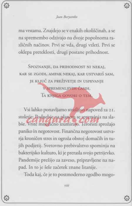 Nov svet se poraja s pospešeno hitrostjo in nekateri se mu bomo prilagajali bolje in hitreje kot drugi. Prožni ljudje vzletijo, drugi se vdajo, prvi postanejo prihodnost, medtem ko se drugi oklepajo preteklosti, izgubljajo upanje in zdravje. Dobra novica je, da prožnost ni genetsko darilo, namenjeno le nekaterim, ampak veščina, ki jo je mogoče hitro razumeti, vaditi in obvladati. Ko se spremembe in negotovost stopnjujejo, je nujno, da se soočimo z resničnostjo, delujemo, poiščemo globlji pomen v življenju, se pogosto smejemo in obvladamo improvizacijo.