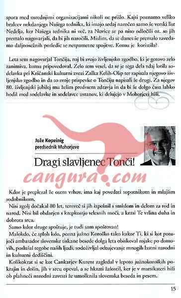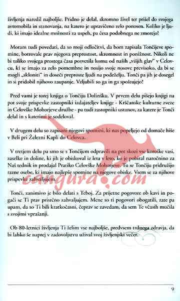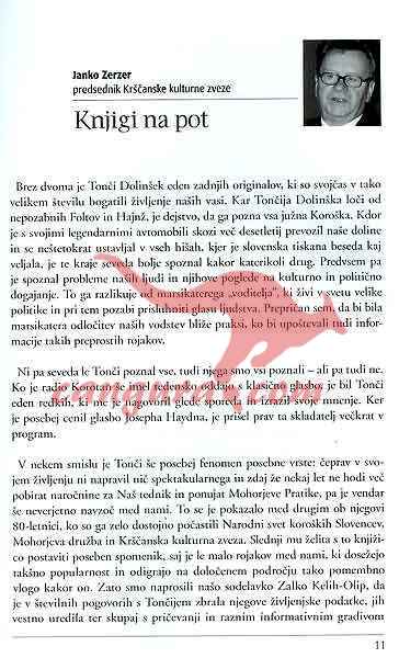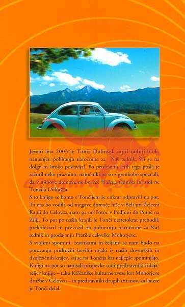 S to knjigo se bomo odpravili s Tončijem Dolinškom še enkrat na pot. Vodila nas bo od njegove domače hiše v Beli pri Železni Kapli do Celovca ter po vseh krajih na Koroškem, kje še govorijo slovensko. Potovali bomo po poteh in krajih, ki jih je Tonči prevozil ali prehodil, ko je pobiral naročnino ali pa prodajal Mohorjevo Pratiko…