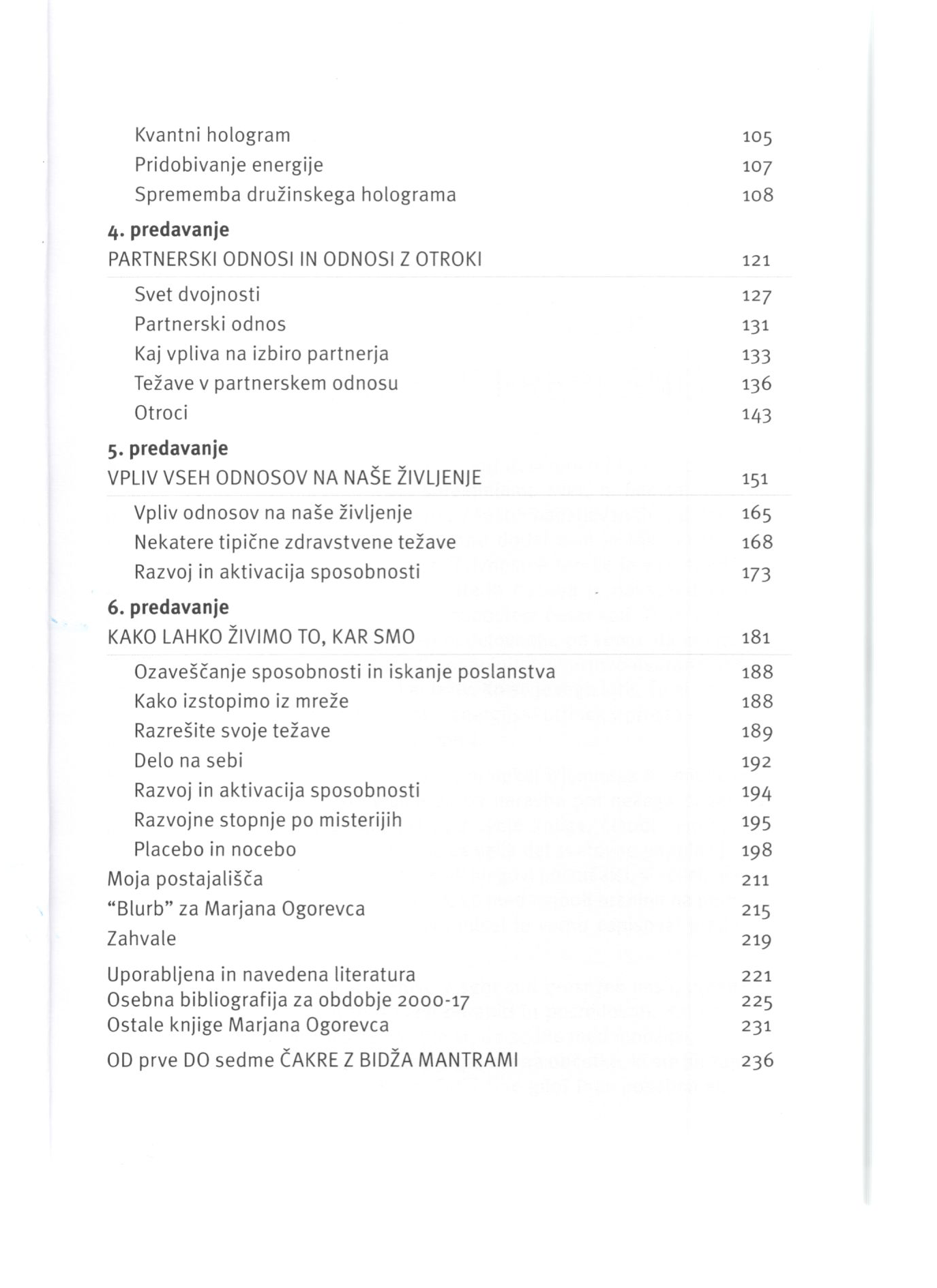 * V četrtem poglavju se bomo ukvarjali s partnerskimi odnosi, ki nam prinašajo najbolj travmatične in boleče izkušnje. Pogosto smo ujeti v odnos, ki ga ne moremo in ne znamo niti razrešiti niti prekiniti. Spoznali bomo razloge, zaradi katerih so partnerji včasih nekompatibilni. Ker otroci zavzemajo vidno mesto v naših življenjih, je pomembno razumeti, zakaj dobimo take in take otroke ter kaj nas ti učijo. Vodeni proces lahko prinese veliko olajšanje in tudi marsikomu pomaga k odločitvi.