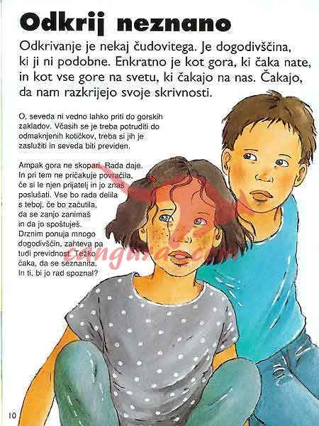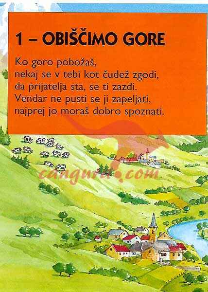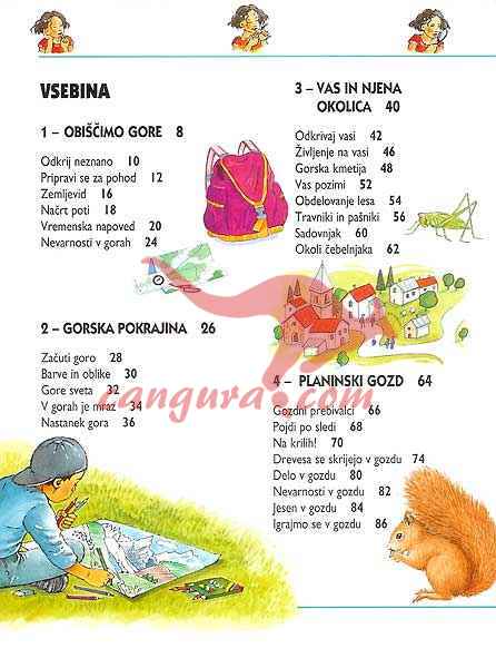 Da boš spoznal goro, moraš dobro opazovati okolico, prisluhniti, kaj se dogaja okrog tebe, ne pozabi pa tudi na srce in ga široko odpri vsemu, kar te obdaja. Poskusi opisati z eno besedo, kako se ti zdi: ali je zabavno, lepo, tesnobno, veliko, mirno, krasno, strašljivo, tiho, … Ko se ozreš okrog sebe, vidiš pokrajino različnih barv in oblik. Vidiš lahko vrhove, kope, hribovje, slap, planoto, steno, dolino, prepad, melišče, pašnik, ledenik, kočo, zavetišče, hudournik. Morda česa od naštetega ne poznaš – poglej v knjigo V HRIBIH IN GORAH, v njej je prav vse razloženo. In ker imaš v nahrbtniku tudi papir in barvice, jih nariši za spomin. Pot v hribe ali gore začneš v dolini, v vasi ali njeni okolici. Tudi o vasi in življenju v njej je napisanega veliko zanimivega. Na primer o travnikih in pašnikih, živalih in rastlinah na njih, kaj na travniku počnemo. V vasi so tudi sadovnjaki, opisana so nekatera sadna drevesa in nasvet, kako sam lahko posadiš jablano. In kjer je drevje in sadje so tudi čebele, ki dajejo sladek med. Med uporabimo za zdravilo, pa tudi za kolače – recept najdeš v knjigi. Nad vasjo nas pozdravi gozd s svojimi prebivalci, gozdnimi živalmi. Nekaj jih zagotovo že poznaš, nekaj pa jih boš spoznal po risbah in opisih v knjigi. Po slikah lahko ugotoviš sledi posameznih živali, najdeš pa tudi napotek, kako sledove ohraniš. Opisanih je nekaj najbolj pogostih ptic in njihova domovanja. V gozdu je še veliko drugih zanimivosti, na katere te opozarjajo besedilo in slike v knjigi. Izbereš si lahko tudi svoje drevo, ga objameš, mu zaupaš svoje skrivnosti in tako postaneta prijatelja